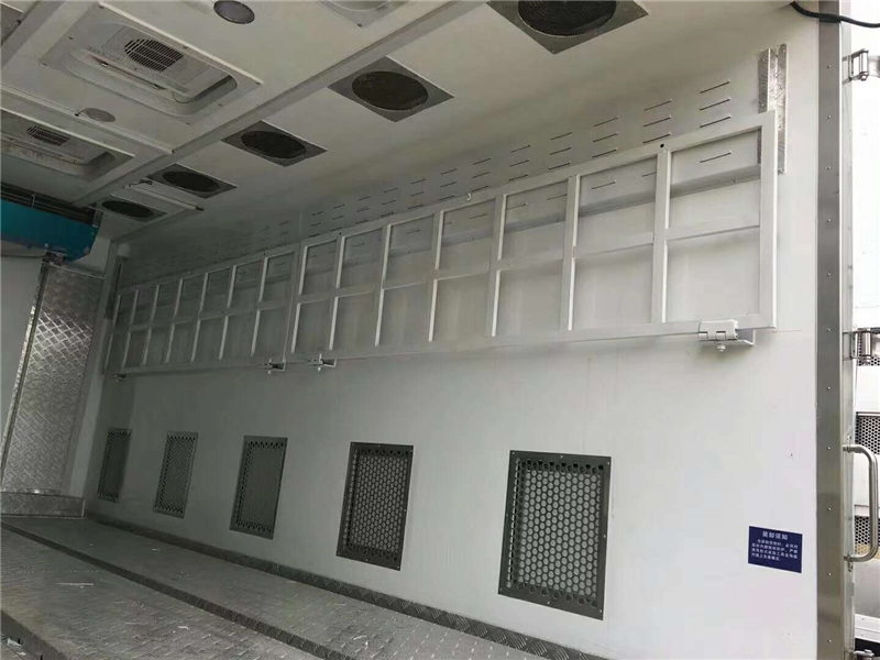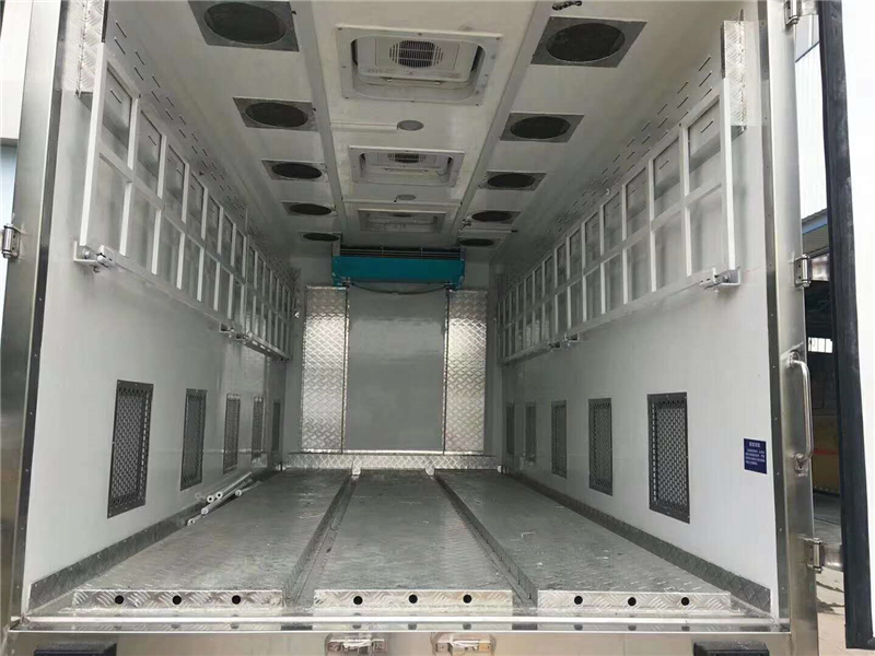 【豬苗車(chē)】上裝配置:外玻璃鋼,內(nèi)不銹鋼,兩層液壓升降層板,尾部液壓翻轉(zhuǎn)上豬平臺(tái),層板為不銹鋼骨架鋪鋁花紋板。外部電動(dòng)升降窗,排氣扇,柴油發(fā)電機(jī),暖風(fēng)加熱,喂水系統(tǒng),凈水箱、污水