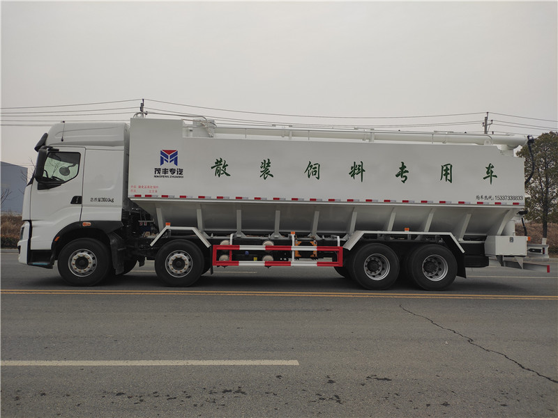 散裝飼料車,又名散裝飼料運(yùn)輸車,飼料運(yùn)輸車。結(jié)構(gòu)簡單、性能可靠、輸送量大、操控方便、機(jī)動(dòng)性強(qiáng)、對物料無污染等特點(diǎn),廣泛應(yīng)用于各大中小型養(yǎng)殖企業(yè)的飼料的運(yùn)輸。散裝飼料車的飼料罐架設(shè)在卡車的底盤上,罐頂開有進(jìn)料口.頂部的一根螺旋輸送卸料管(俗稱卸料絞龍)則可自由回轉(zhuǎn)和抬升,抬升的仰角可達(dá)60度。運(yùn)輸時(shí),頂部的螺旋管平臥在罐頂;卸料時(shí)則抬起,使管端的出料口與畜禽飼養(yǎng)場貯料罐頂部的進(jìn)料門相接,駕駛室內(nèi)裝有操縱裝置(操縱裝置也可裝置在罐體尾部),卸料時(shí)通過車底的動(dòng)力輸出軸和減速器來驅(qū)動(dòng)螺旋,以完成卸料。